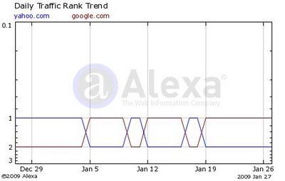 从其公布的数据看,2007年10月,Google 的独立访问者开始超越雅虎,但结合人均页面浏览数,雅虎仍然占优。2009年1月5日,Alexa日综合排名,谷歌第一次超越雅虎成为第一。此后虽有几次波动,但从1月19日开始现已趋向稳定,谷歌持续位居第一位。
